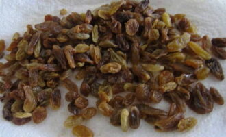 Vul de rozijnen met heet water gedurende 10 minuten, was ze en droog ze af.