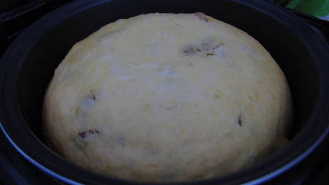 - Voeg de rozijnen toe aan het deeg, roer en laat het deeg 1 uur warm staan. Nadat het deeg goed is gegroeid, plaatst u het in de kom van de multikoker. Vet de kom in met boter.