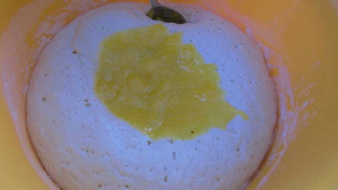 - Voeg vervolgens zachte boter toe en meng volledig door het deeg. Dek het vervolgens af met een handdoek en laat het 40-60 minuten op een warme plaats rijzen.