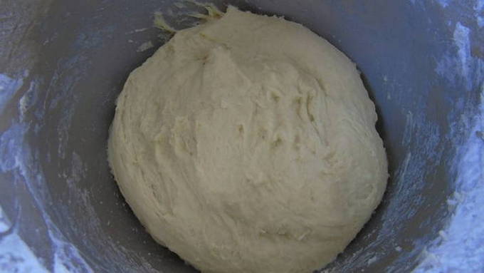 - Meng in een kom gezeefde bloem, snelwerkende gist, suiker, vanillesuiker, eieren, kwark en zachte boter.