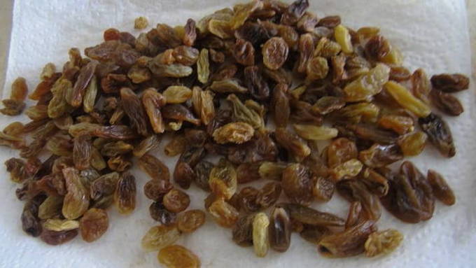Vul de rozijnen met heet water gedurende 10 minuten, was ze en droog ze af.