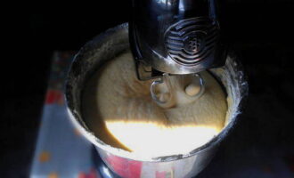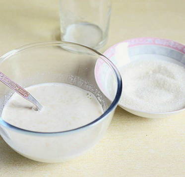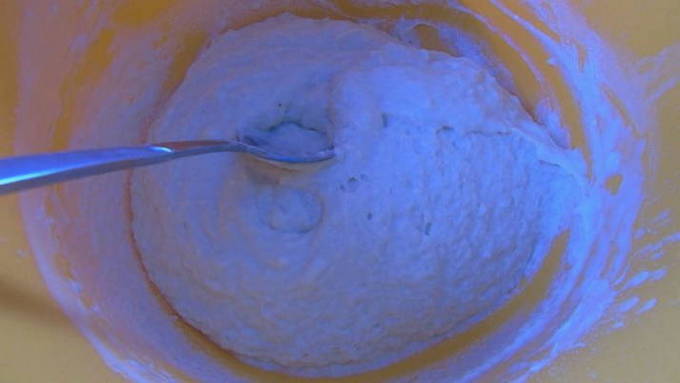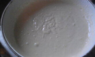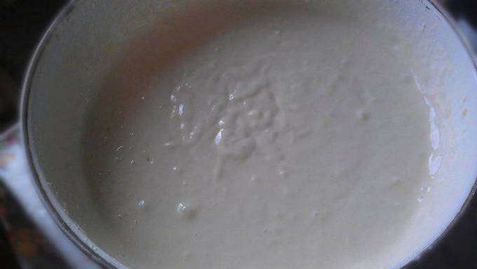 - Los een theelepel suiker en gist op in warme melk. Dek de kom af met huishoudfolie en laat 15 minuten op een warme plaats staan. Het deeg moet in omvang verdubbelen.