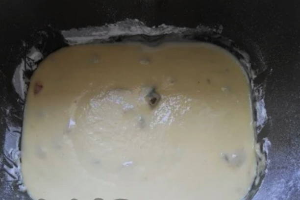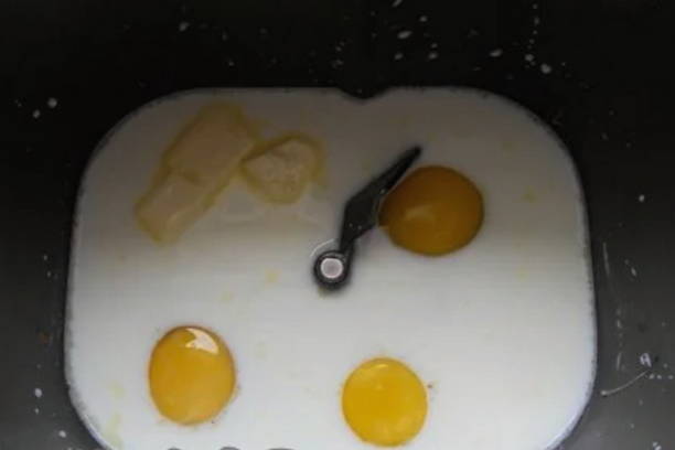 - Giet warme melk in een emmer van een broodmachine, voeg eieren en zachte boter toe.