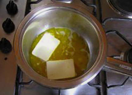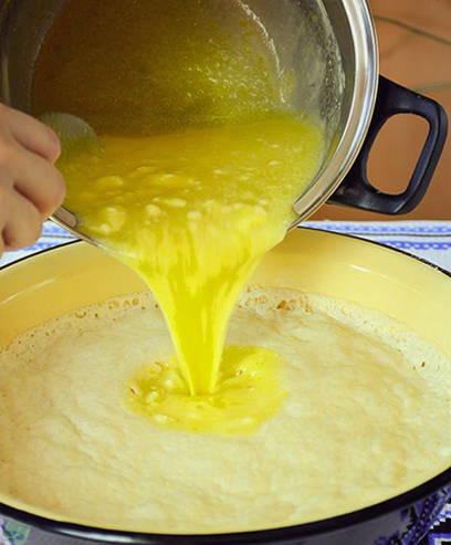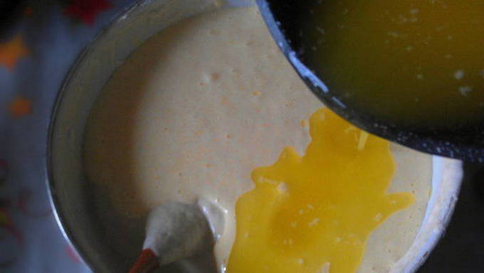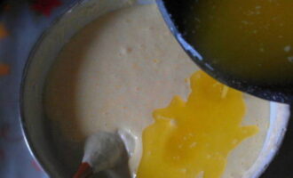- Smelt de boter, koel af en voeg toe aan de eiermassa.