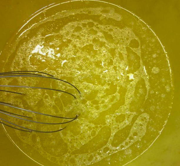 - Meng in een kom sinaasappelsap, water, zout, suiker en plantaardige olie.