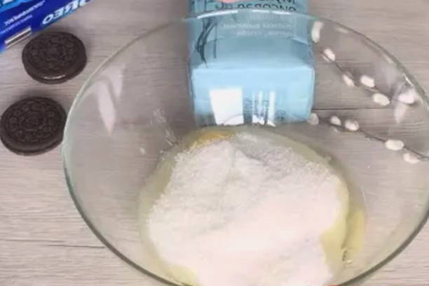 - Mix de eieren met suiker en vanillesuiker tot een glad mengsel.