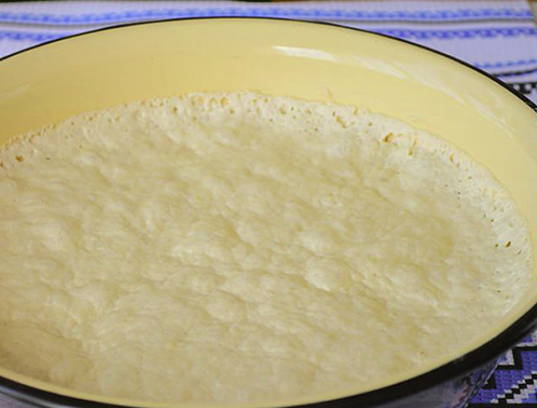 - Verwarm de melk tot 35-40 graden, voeg een eetlepel suiker, gist en 250 gram bloem toe. Kneed het deeg en laat het een half uur op een warme plaats staan.
