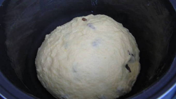 - Voeg rozijnen en rasp toe aan het gegroeide deeg, meng goed. Leg het deeg in een met olie ingevette multicookerkom. Laat het deeg 10-15 minuten rusten.