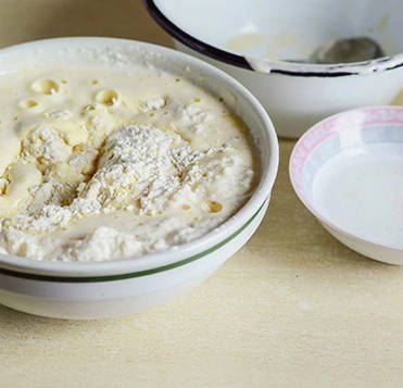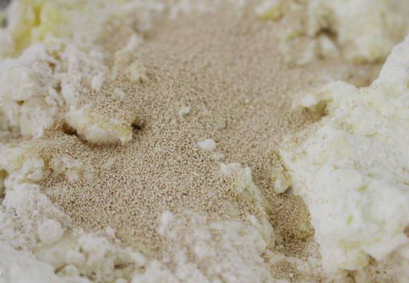 Giet de droge gist, een eetlepel suiker en de helft van de bloem bij de warme melk. Meng de ingrediënten en laat een half uur op een warme plaats staan.