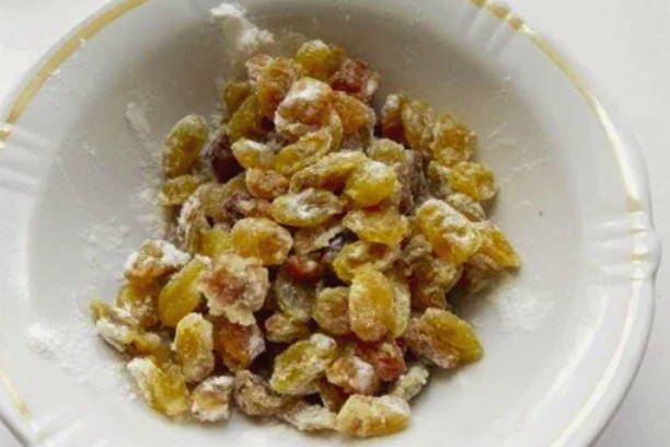 - Vul de rozijnen met heet water, laat 10 minuten staan, spoel ze daarna af en droog ze af.