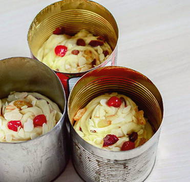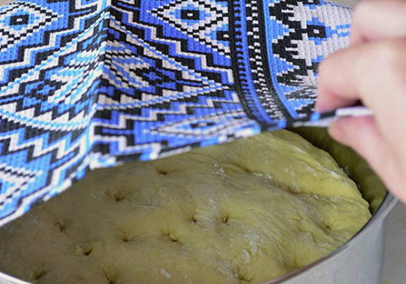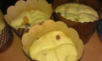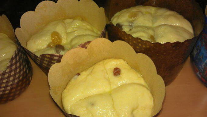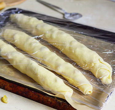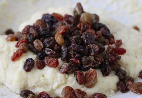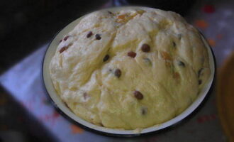 Was de rozijnen met heet water, droog ze, rol ze door de bloem en voeg ze toe aan het deeg. Laat het deeg weer 30-60 minuten op een warme plaats staan.