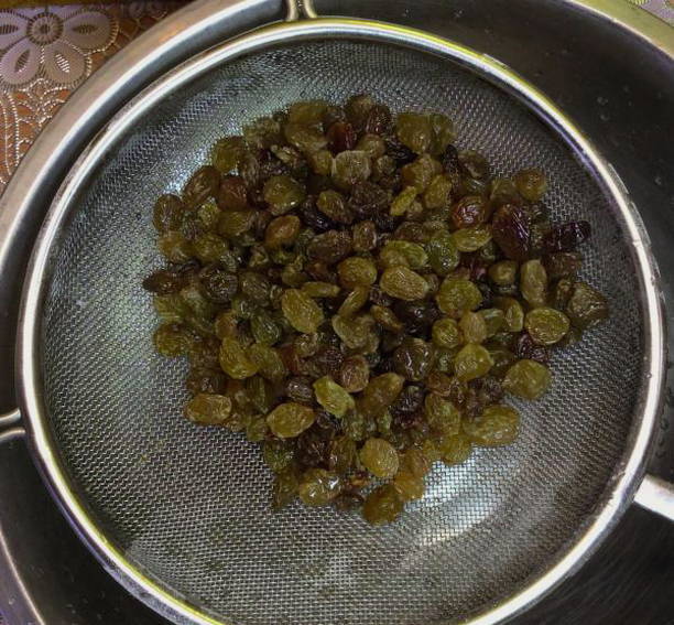 - Giet de rozijnen met heet water en laat 15 minuten staan. Spoel het vervolgens af en leg het op keukenpapier om de vloeistof af te tappen.