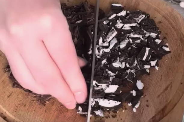 - Voeg ten slotte gehakte chocolade en Oreo-koekjes toe aan het deeg. Roer het deeg en laat het 20 minuten staan.