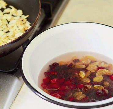 - Giet rozijnen, kersen en veenbessen 5 minuten met kokend water. Was vervolgens het gedroogde fruit en dep droog op keukenpapier. Bak de amandelblaadjes in een droge koekenpan.