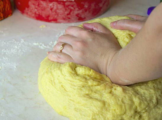 - Zeef bloem in een kom en kneed het deeg. Het moet elastisch zijn en goed uit je handen plakken.