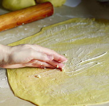 - Verdeel het deeg in 2-3 gelijke delen, rol ze dun uit en bestrijk ze met boter.