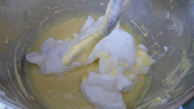Smelt de boter op laag vuur en laat afkoelen. Verdeel de eieren in eiwitten en dooiers. Pureer de dooiers met suiker, klop de blanken tot een wit schuim. Voeg vervolgens de dooiers, gesmolten boter, vanillesuiker, zout en opgeklopte eiwitten toe aan het bijpassende brouwsel.