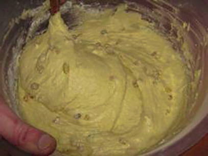 - Voeg de rozijnen toe aan het deeg en roer.