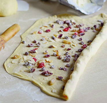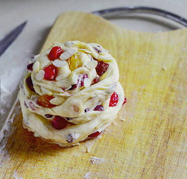 - Strooi gedroogde vruchten over het deeg en rol de broodjes op.