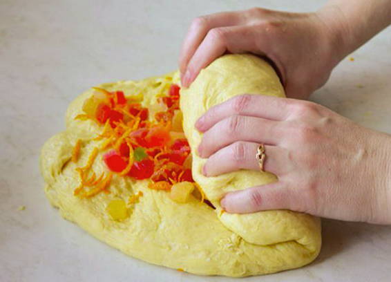 - Het deeg neemt 2-3 keer toe, leg het op tafel, wikkel het met je handen, verdeel het in delen en druk het een beetje plat. Smeer gekonfijte vruchten en sinaasappelschil op het deeg, rol het deeg in een envelop of rol.