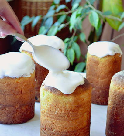 - Bereid het glazuur voor. klop het eiwit, de poedersuiker en het citroensap tot een wit schuim. Giet het glazuur over de taarten, wacht tot het hard is en serveer de gebakjes op tafel.