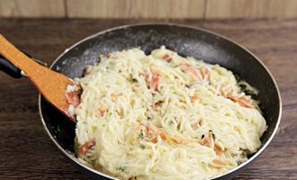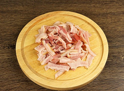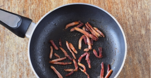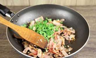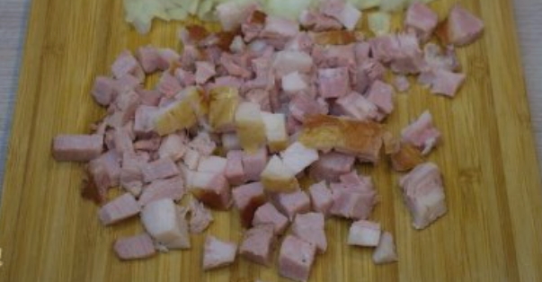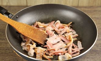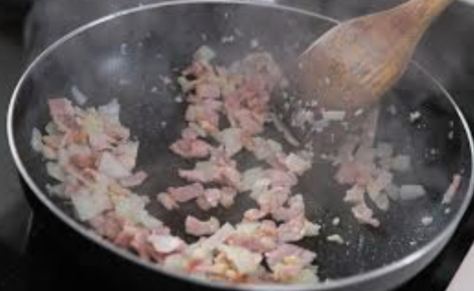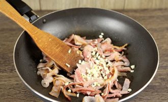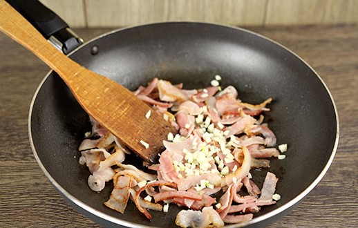 - Snijd het spek in blokjes of partjes. Als je wilt, kun je half en half spek en ham nemen, of de eerste volledig vervangen door de tweede. Giet in een koekenpan met uien en bak ongeveer 1-2 minuten, voeg gedroogde knoflook toe.