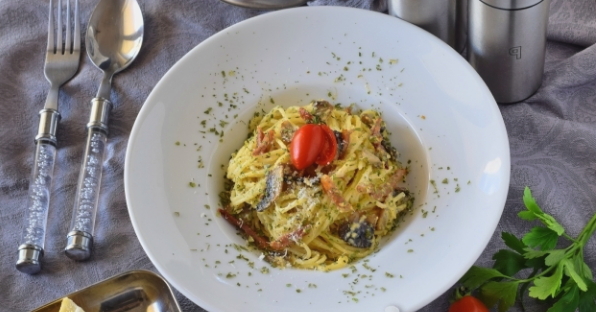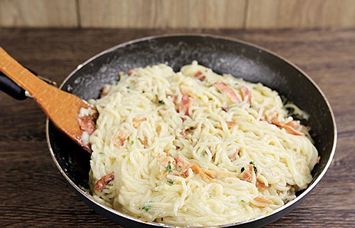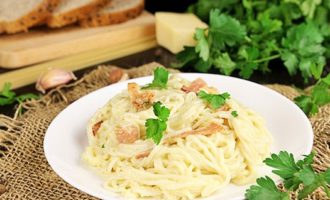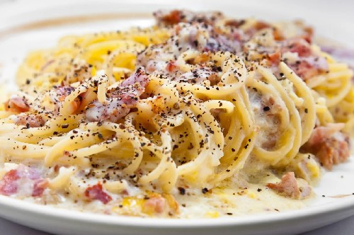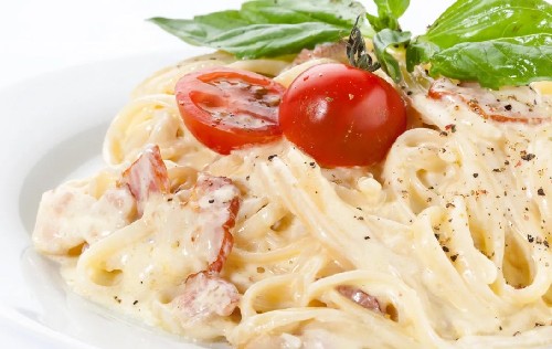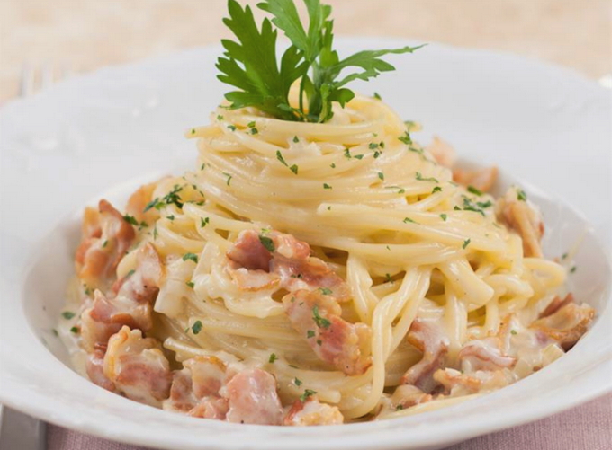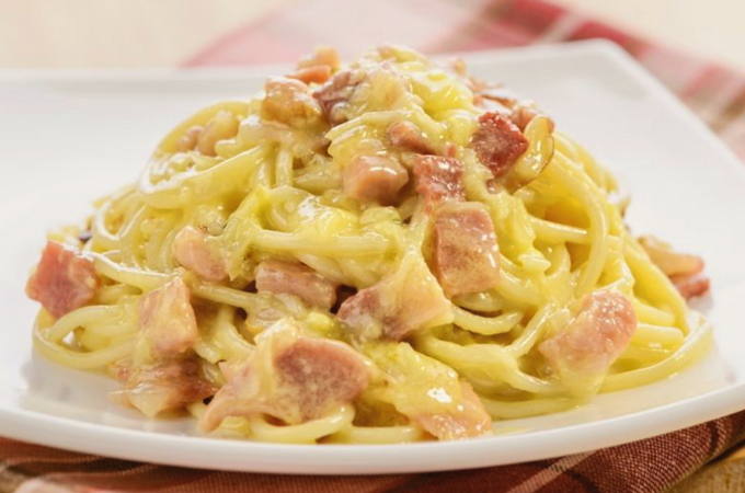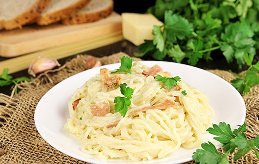 Het klassieke recept voor carbonara-pasta omvat het gebruik van spaghetti. Het is raadzaam pasta van harde tarwe te kopen, zodat deze niet overkookt en vorm verliest. De romige saus geeft het gerecht een bijzondere malsheid en sappigheid.