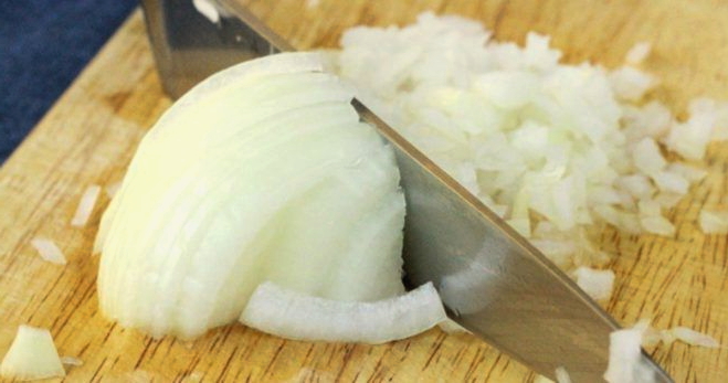 - Pel intussen de ui, spoel af en snij in kleine blokjes.