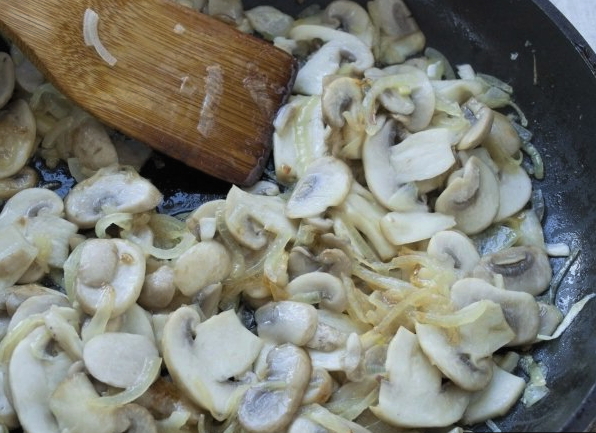 - Zet de pan op middelhoog vuur met plantaardige olie. Bak de champignons en uien tot ze lichtbruin zijn, wacht tot al het water eruit is verdampt.