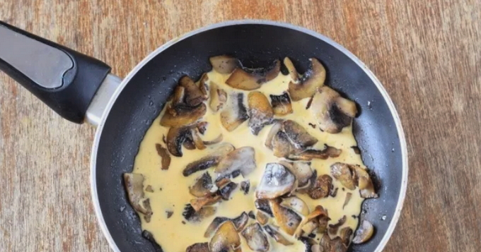 - Snijd het spek in dunne plakjes. Voeg room aan de pan toe aan de champignons, breng op smaak met zout en peper, kook op laag vuur ongeveer 5-8 minuten, onder voortdurend roeren.Proef op zout en kruiden, pas indien nodig aan.