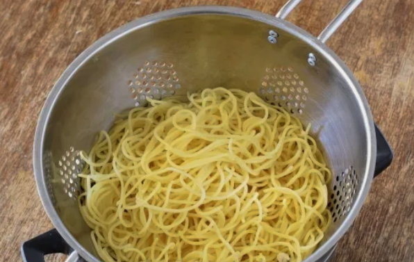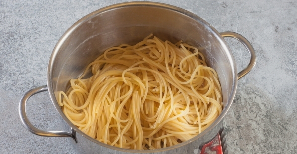 - Kook de spaghetti op de manier zoals aangegeven op de verpakking. Het is raadzaam om de pasta uit te zetten en 1-2 minuten te zeven. voor het einde van het koken.