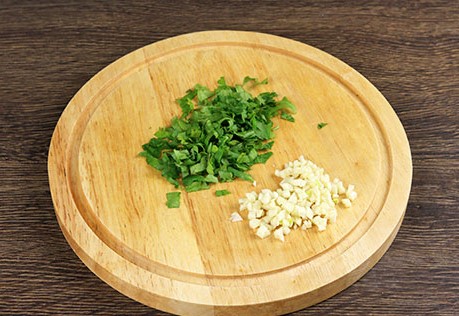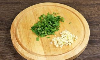 Was en droog de peterselie. Scheur de stelen af en hak de greens fijn met een mes. De bieslook schillen, afspoelen, fijn hakken of door een pers halen.