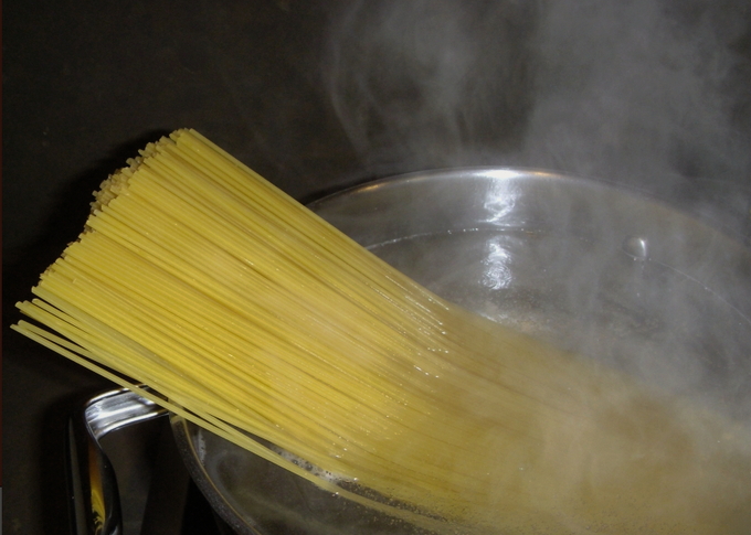 - Spaghetti mag uitsluitend van durumtarwe worden gekocht. Kook water in een pan, voeg een beetje zout en olijfolie toe. Kook de spaghetti totdat deze een beetje aan je tanden plakt.