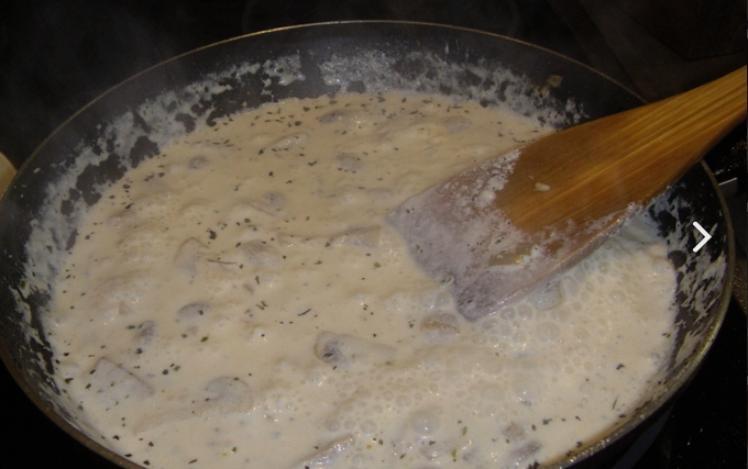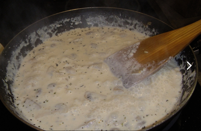 - Voeg room toe aan de pan en breng op smaak met zout. Laat alles op laag vuur sudderen om te voorkomen dat de room gaat stremmen.