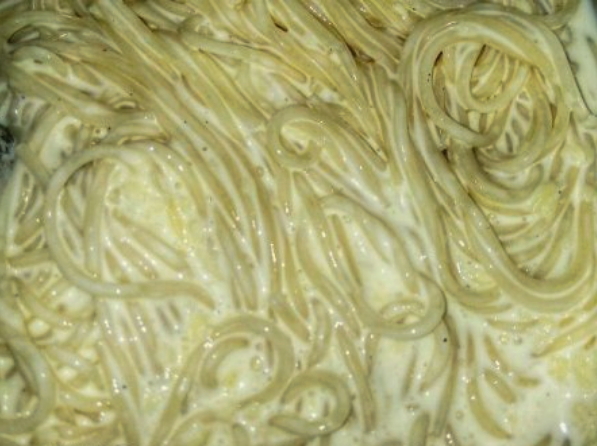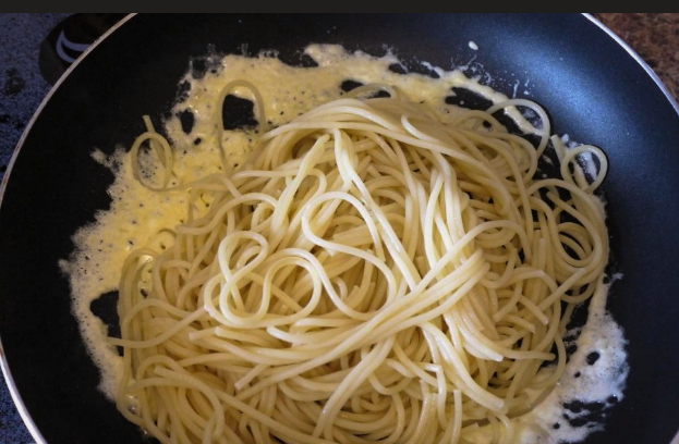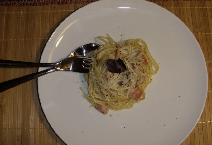 - Doe spaghetti in een serveerschaal, voeg spek toe, overgiet alles met de resulterende saus. Je moet de pasta meteen opeten, want koud is hij niet meer zo lekker en het is niet aan te raden om hem in de magnetron op te warmen.