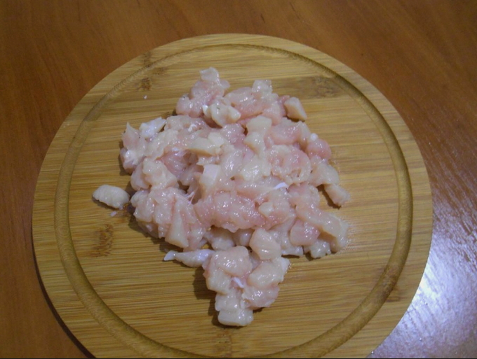 - Snijd de kipfilet en het spek in kleine blokjes, giet de olijfolie in de pan en bak ze gaar.