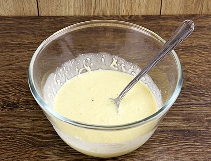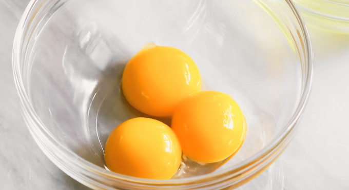 - Scheid voor de saus de dooiers van de eiwitten (wit is niet nodig). Combineer de dooiers, klop met een vork, voeg zout, gedroogde basilicum (kan worden vervangen door een mengsel van Italiaanse kruiden), sesam en fijn geraspte Parmezaanse kaas toe.