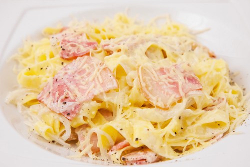 Delicate pasta carbonara met spek, ham en room
