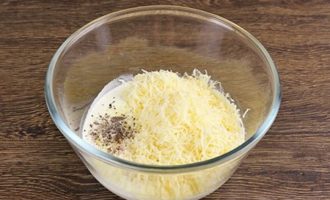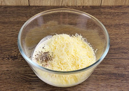 - Rasp de kaas op een fijne rasp. Giet room in een klein diep bord, voeg kaas in porties toe, onder voortdurend roeren.