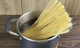 Kook spaghetti volgens de instructies op de verpakking. Het belangrijkste is om de producten niet te verteren zodat ze een beetje aan de tanden blijven kleven (dit preparaat wordt al dente genoemd).