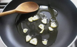 Snijd de knoflook in grote stukken en bak in olijfolie om de olie zijn aroma te geven. Daarna kan de knoflook worden verwijderd.