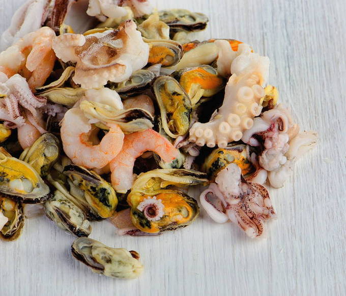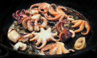 - Ontdooi de zeevruchten in een warme kamer en laat ze met de toevoeging van olie in een frituurpan ongeveer 7 minuten sudderen, tot het vocht verdampt is.