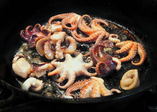 - Doe garnalen en plakjes inktvis in een pan met knoflook, kook enkele minuten, maar niet meer dan vijf. Houd een paar garnalen apart om het afgewerkte gerecht te versieren.