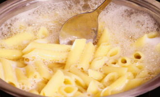 Kook de pasta volgens de instructies op de verpakking, laat het iets niet gaar zodat het zijn vorm niet verliest, omdat het verzadigd is met de saus. Doe de uitgelekte pasta in de pan en laat 2 minuten staan.