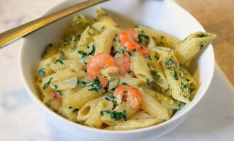 - Delicate pasta met garnalen en zalm in een romige saus