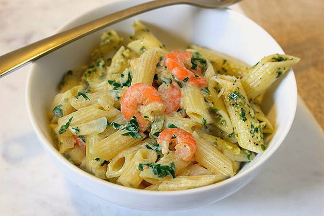 Heerlijke pasta met coquilles en garnalen in een romige saus