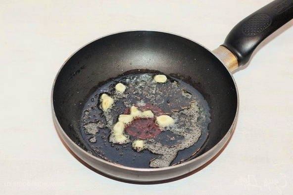 - Pers de knoflook en hak ze fijn, doe ze in een diepe koekenpan met gesmolten boter en plantaardige olie en bak ze lichtjes op middelhoog vuur.