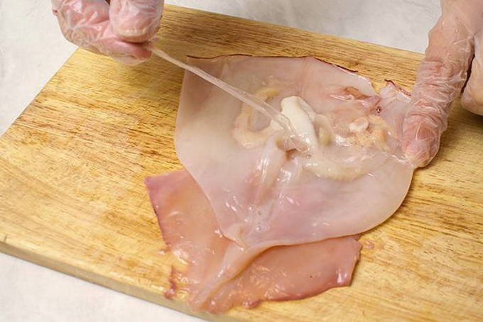 - Giet kokend water over de inktvis, verwijder het vel, verwijder de binnenkant en snijd in kleine stukjes.
