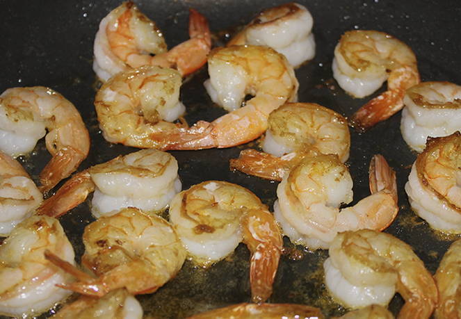- Verwijder de ader van de garnalen en voeg toe aan de vis, bak een paar minuten, tot ze rood beginnen te worden.
