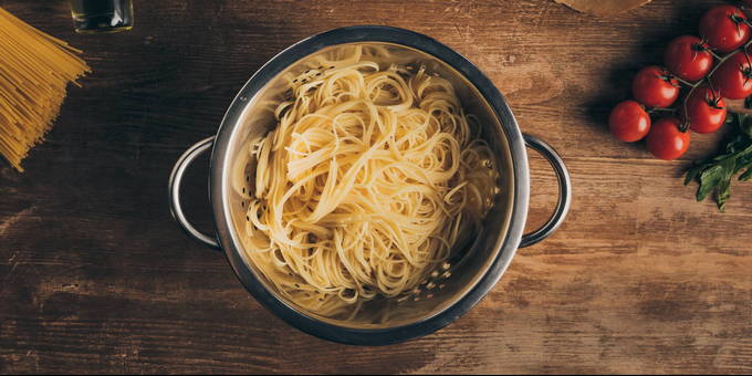 - Kook de spaghetti apart zodat ze bij het bijten iets niet gaar zijn. Volg de instructies op de pastaverpakking. Zeef de afgewerkte spaghetti, maar spoel hem niet af en doe hem in de pan bij de saus.